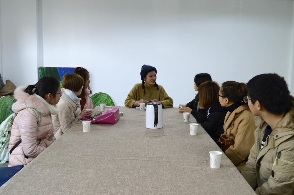 2016届汉语言文学专业的优秀毕业生王佳丽。王佳丽学姐带领同学们参观了匠心公司的展览墙、工作间,向八位学弟学妹们毫无保留地讲述了匠心弯弯曲曲的创业之路,分享了自己一路走来的复杂心情。她说:“因为是初创型公司,工作人员不多,所以大家都是身兼数职,每天工作时间基本都在14小时以上,所以如果学弟学妹们想创业,一定要有承受失败的心理和高强度高要求工作的准备,”她还特别感慨:“现在没有空看书,但是在和其它公司谈合作中,在自己做项目中急切地感觉到知识面上的狭窄,有时甚至是空白,所以非常后悔大学期间没有一有空就读书。”