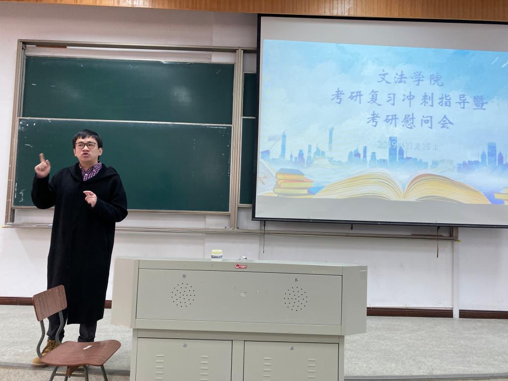 举行了2020届毕业生的考研冲刺复习指导暨考研慰问会。学院党委副书记虞岚老师、学工办吴燕老师、上海大学民商法博士余泉君老师和100余位考研学生参加了此次会议。