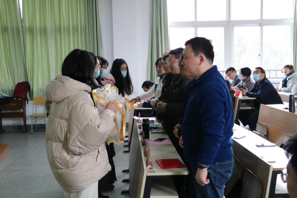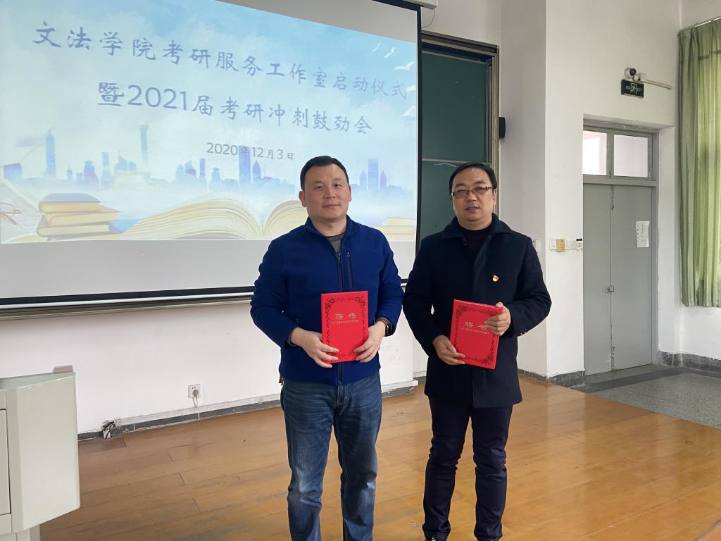 考研服务工作室的成立文件,文法学院院长欧阳仁根老师为工作室的两位主任颁发了聘书。随后,各领导为到场的考研同学代表发放慰问品,表达了学院对各位同学在冲刺阶段的关怀、期望与鼓励。汉教171班章馨尹同学代表2021届考研同学发言,讲述了身边同学自备考来的变化以及对学院领导关心的感谢,同时表达了在冲刺阶段全力以赴的决心。