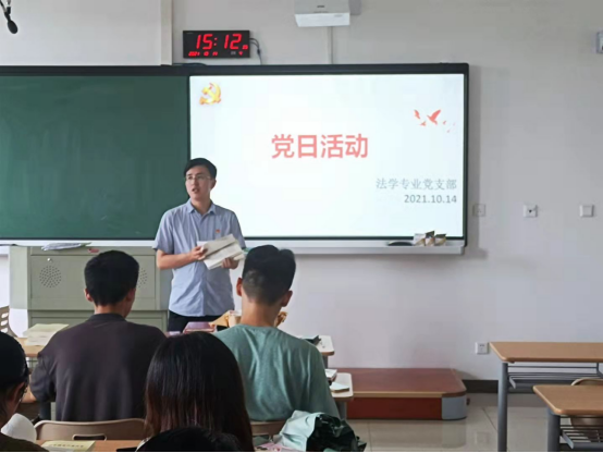 法学专业的党支部在厚德楼258开展“奋进新征程,打造‘金名片’”党日活动。支部全体党员参加,活动由支部书记计丹峰主持。