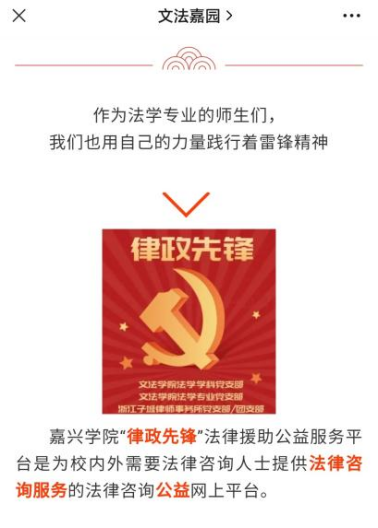 3月5日,法学专业党支部开展了“3·5学雷锋”线上法援活动。针对“新冠特殊时期”法律咨询需求人员问题多、出行不便、咨询难等现实情况,师生党员们联合资深律师在微信端开通了“律政先锋”法律援助咨询平台,为广大师生和校内外群众开通“方便门诊”。