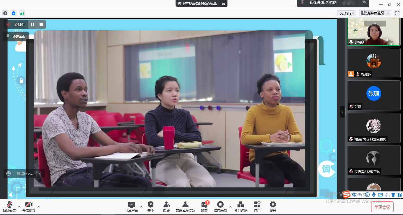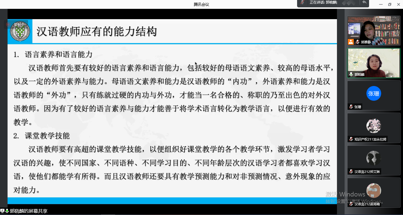 2021129日晚,《汉语教师的素养与常用教学方法》学术讲座在成人电影 成功举办。为了积极配合疫情防控工作,本次讲座通过腾讯会议平台召开。本次讲座邀请了北京语言大学博士生导师郭晓麟教授,留学生教学团队教师,汉教专业、汉语言专业和法律专业学生等70余人参加了讲座。
