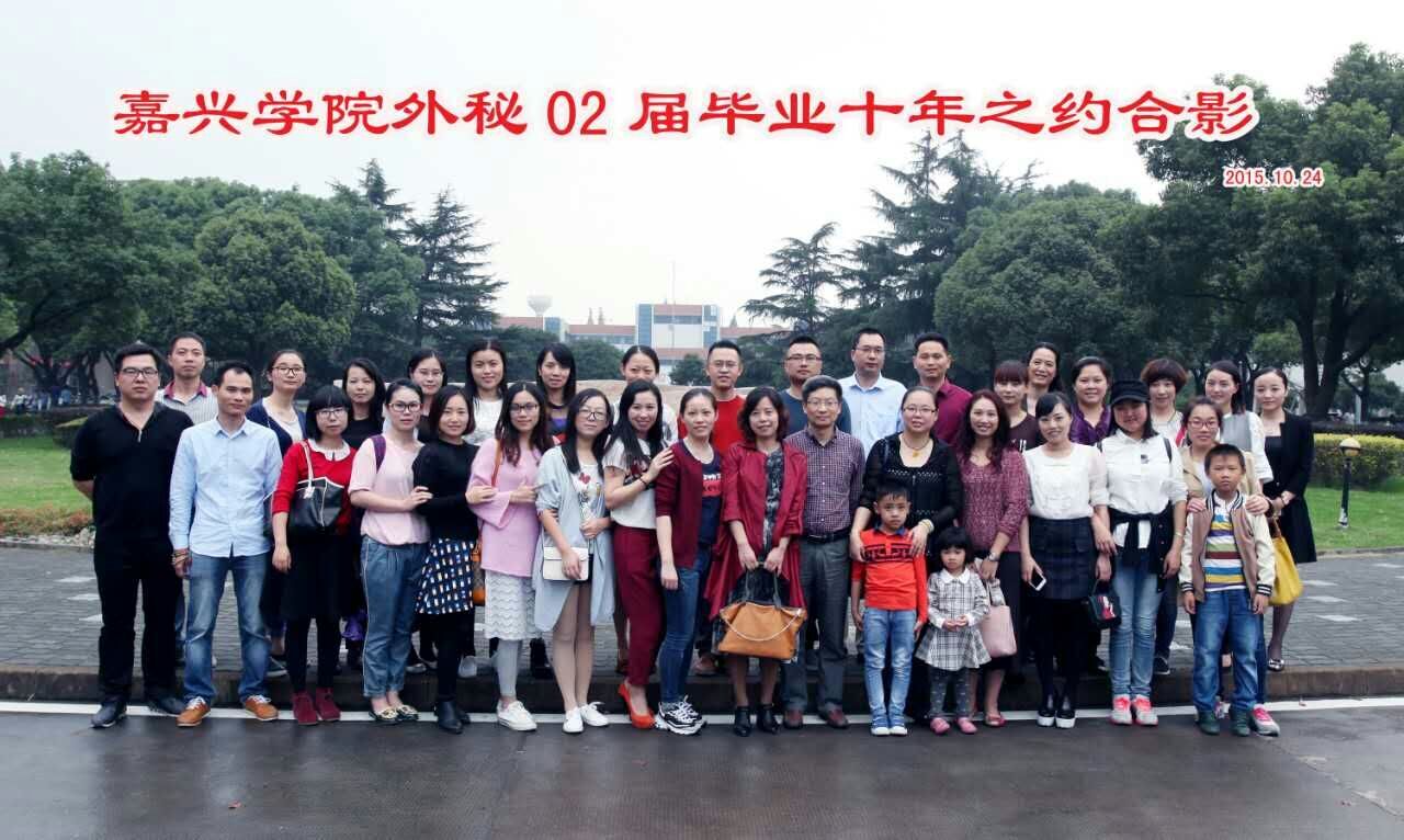 涉外秘书02级的同学会活动主要由当天的走访校园、聚餐以及第二天游览嘉兴各景区以及果园烧烤等活动组成,内容简朴,但同学们仍然相聚甚欢,无比喜悦。从2005年到2015年,同学们都已步入而立之年,迈出校园的门,收获了事业与家庭的两重厚赠。一回到学校,顿时恢复了活力四射的青葱劲头。无论是在昔日的文化广场漫步,在教二的教室里静静地思念对面同学当年的容颜,还是在校训石前面合影,时光都恍若回到昨日。有种感觉,穿越了10年毫无违和感地出现了。离开校园十载光阴,我们都忘不了当年的那个寝室,都忘不了挥洒汗水的操场,更忘记不了恩师当年的指点。十年前,他们在三尺讲台之上传道授业解惑,讲知识、传技能,谈人生。他们让我们具备了踏上工作岗位所需的良好素养。十年以后,我们又汇聚到了他们身边,向他们报收获,表谢意,,谈理想,聊家常,再一次聆听他们的教诲。犹记当年毕业聚餐上“觥筹交错”情形,一杯杯酒和着离别的热泪;现如今毕业十年同学会的酒桌上,我们看着熟悉又略有陌生的脸庞,当年的万千不舍化作现如今的频频道珍重。看着电视机里播放着的当年我们在校园里的照片,大家不由感慨万千,既有对岁月流逝的感喟,也有对时代进步、自身成长的欣喜。。嘉兴学院,是我们挥洒过青春、满沁了感恩与汗水的地方,是我们曾经激情昂扬的乐园、启航人生的港湾。当年我们是揣着美好的憧憬和师长的谆谆教诲,奔向我们的似锦人生。如今,我们有了人生非常珍贵的十年积淀,带着人生拼搏的经验和自信重返校园,带着美满生活回学校向老师汇报。
