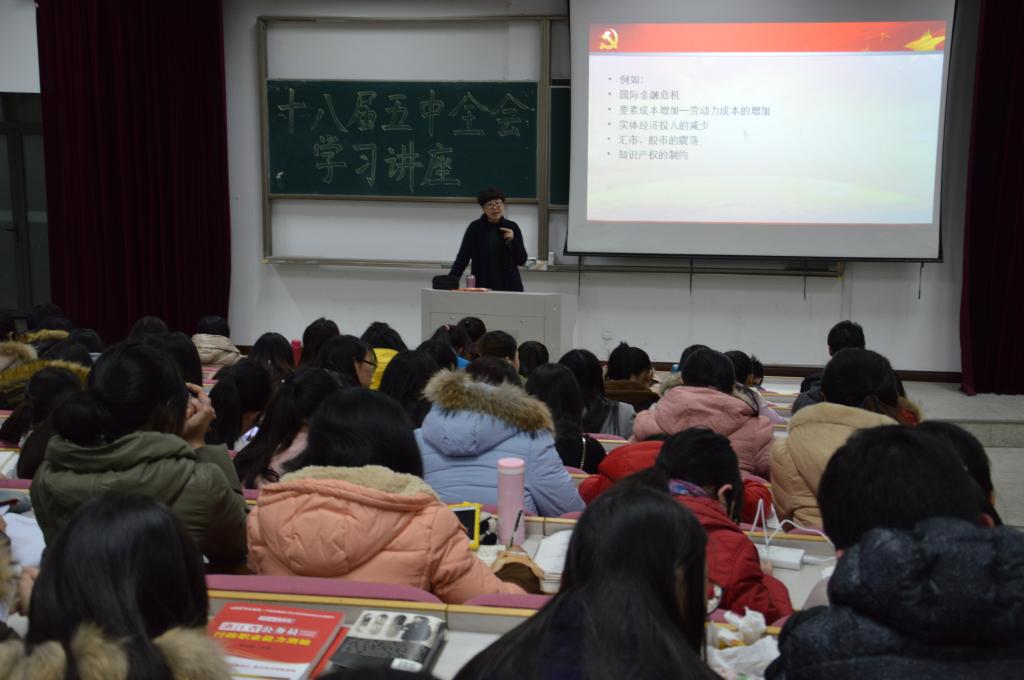 2015年12月16日,成人电影 党委在梁林校区7号楼报告厅组织学生学习十八届五中全会精神。本次学习会由学工办主任虞岚主持,成人电影 党委书记费锦红主讲。