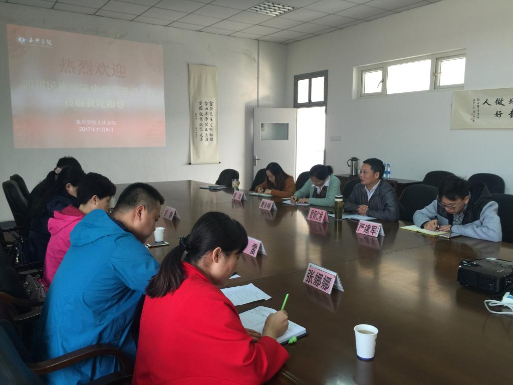 2017年11月8日,四川民族学院法学院、马克思主义学院党总支书记康亮芳一行来成人电影 调研交流。成人电影 院长欧阳仁根主持召开调研交流会。学院法学系副主任唐永梅及学院三办主任参加了会议。会上,两院就法学专业师资队伍建设、人才培养方案改革、专业课程建设改革、实验室建设、校地合作实践基地建设、第三方教学质量评价体系等方面的内容进行交流研讨。同时两院希望借此契机进一步加强交流与合作,互相学习。会后,学院还带领他们参观了学校红船研究中心。