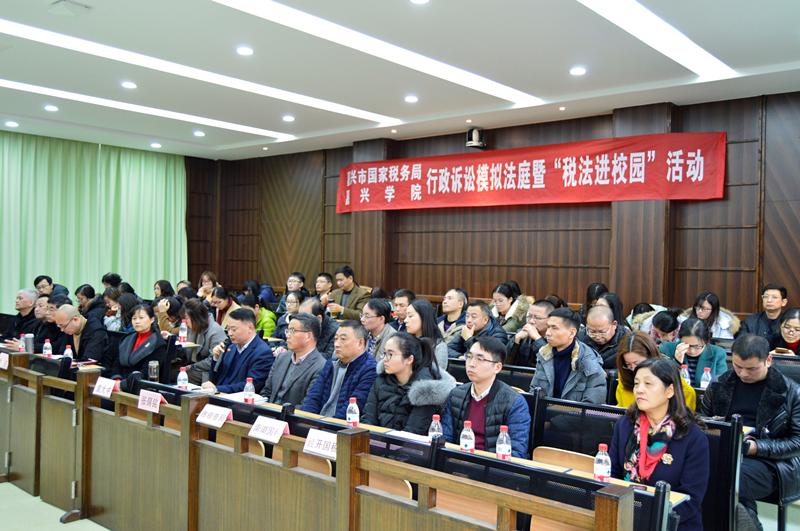 1227日下午,由嘉兴市国家税务局与成人电影 成人电影 联合开展的行政诉讼模拟法庭暨“税法进校园”活动在梁林校区1号楼模拟法庭顺利举行。嘉兴市国税局局长袁大中、市稽查局局长姚顺龙,成人电影 院党委书记洪坚、成人电影 副院长童建华,以及来自嘉兴市政府法制办、市司法局宣教处、南湖区和秀洲区国税系统的领导和工作人员以及成人电影 部分法学专业学生参加了活动。