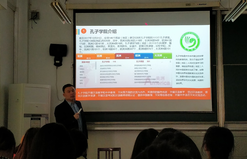 屈老师首先结合当下的国际形势介绍了孔子学院设立的背景和重要意义,然后讲解了汉语教师志愿者项目,就汉语教师志愿者报考政策、有关要求和流程以及工作内容、待遇、职业规划等方面的知识向同学们作了详细介绍,对同学们提出的问题进行了解答,并勉励同学们积极踊跃地参加到汉语教师志愿者项目中去。