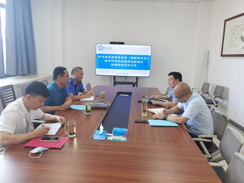 7月26日上午,嘉兴经济开发区(国际商务区)综合行政执法局肖永刚局长一行来成人电影 交流工作,成人电影 副院长(主持工作)童建华、副院长屈正林参与交流座谈。