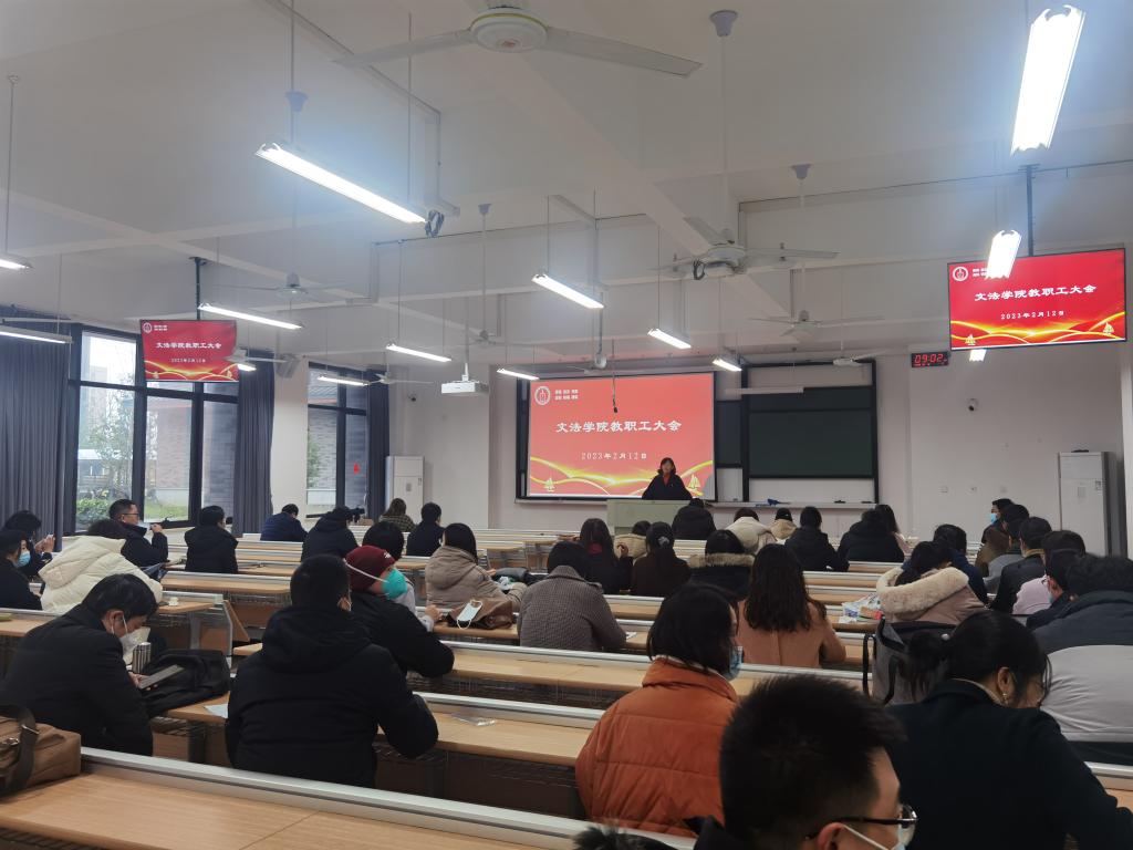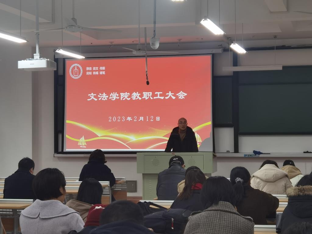 在厚德楼122召开了2023年新学期全体教职工大会。大会由党委书记洪坚主持。