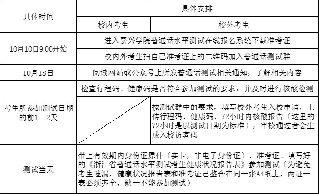 2022年(下)嘉兴学院梁林校区普通话测试时间为11月2日至11月9日(如有变动或增加考试场次会另行通知)。具体安排请考生自行下载《2022年(下)嘉兴学院梁林校区普通话水平测试名单及安排表》(见附件)查看,请考生仔细阅读本通知内容,根据下面时间安排表,按顺序进行操作。