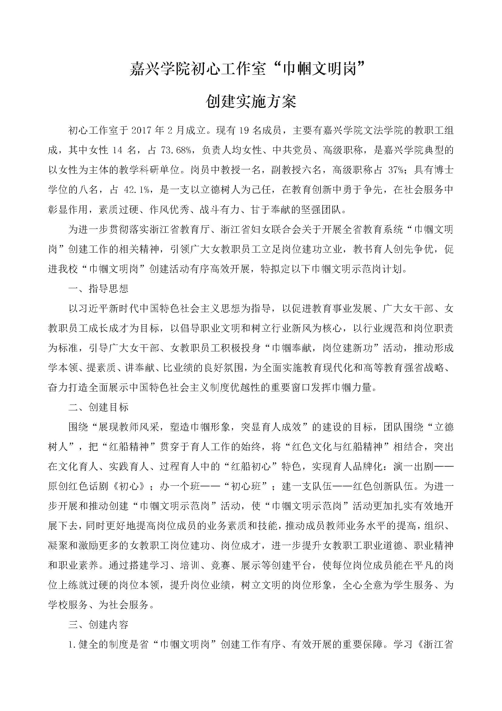 嘉兴学院初心工作室“巾帼文明岗”创建实施方案