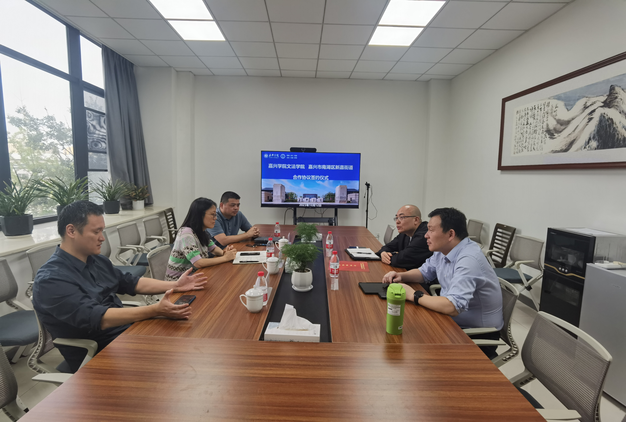 与嘉兴市南湖区新嘉街道合作协议签约仪式在厚德楼268会议室举行。新嘉街道党工委副书记韩朱东,政法委员王定海,司法所祝乔,成人电影