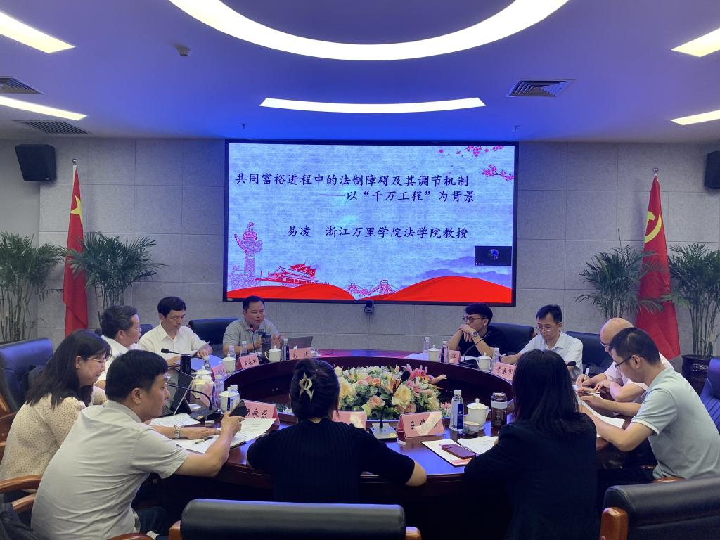 浙江省法学会三农法治研究会副会长、浙江万里学院法学院易凌教授以《共同富裕进程中的法制障碍及其调节机制——以“千万工程”为背景》为题,认为目前存在基本经济制度、公民迁徙自由、社会保障和基本公共服务体系等六方面的障碍,提出应从制度调节机制、先富带动后富机制、培育内生动力机制等方面加以着力解决。