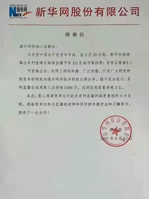 2021513日,嘉兴学院初心话剧社收到了来自新华社的一封感谢信。信中新华社表示,为了庆祝中国共产党百年华诞,自323日起,陆续推出的系列重磅全媒体直播节目《红色追寻第四季:百年正青春》在网上持续热播、广泛传播,引发了广大网民特别是年轻网民共情共鸣共振并积极点赞分享,据不完全统计,系列直播在线观看人次突破5400万,总浏览观看量突破3亿。